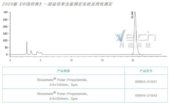 Blossmate? Polar-Propylamide是月旭科技為解決大極性藥物分子的分離而設(shè)計(jì)的一款高端系列親水作用色增(HILIC)柱。該款色譜柱的填料以超高純度、高機(jī)械強(qiáng)度的球形色譜硅膠為基質(zhì),高效鍵合極性丙基酰胺基團(tuán),作為新一代益母草專(zhuān)用色譜柱,其結(jié)果完全符合2020版《中國(guó)藥典》一部益母草含量測(cè)定項(xiàng)下的要求。