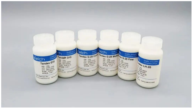 #1 凝膠顆粒大小 顆粒的大小通常用目(mesh)或直徑 (μm)來表示。色譜分離用的凝膠一般都制成球形顆粒。凝膠顆粒的大小直接關(guān)系到色譜柱的流速和分辨率,顆粒越大,流速越快,但分辨率較差;相反,顆粒越小,流速越慢,但分辨率提高。 #2 排阻極限 指不能進入凝膠顆粒內(nèi)部孔隙的更小分子的分子量。排阻極限反應(yīng)某種凝膠能有效分離的更大分子量,所有大于排阻極限的分子均被完全排阻,不能分離。如Tandex G25的排阻極限為5000Da,它表明分子量大于5000Da的分子為全排阻。 #3 分級范圍 (或工作范圍) 所能進入凝膠內(nèi)部孔隙的更大分子和更小分子的分子量范圍。它表示一種凝膠適用的分離范圍,如Tandex G25對球形蛋白的分級分離范圍為1000-5000Da,它表示通過Tandex G25可有效分離分子量在這個范圍內(nèi)的球形蛋白。 #4 吸水量1g干膠吸收水的體積或質(zhì)量。凝膠型號越大,吸水量越大。 #5 床體積1g干膠吸水后的更終體積。 二、體積參數(shù) #1 外水體積 柱內(nèi)凝膠顆粒之間的空隙體積的總和,用Vo表示。 #2 基質(zhì)體積 干膠溶脹后顆粒本身所固有的體積,用Vg表示。 #3 內(nèi)水體積 凝膠顆粒內(nèi)部孔隙體積的總和,或者為小分子溶質(zhì)可滲透進入凝膠內(nèi)部體積的總和,又稱固定相體積,用Vi表示。 #4 柱床體積 凝膠柱裝成后從柱底板到凝膠沉積層表面的總體積,又稱床體積,用Vt表示。 其計算公式為: 由于Vg相對較小,可忽略不計,故有: #5 洗脫體積 某一被分離樣品從凝膠柱內(nèi)完全被洗脫出來時所需洗脫液的體積,用Ve表示。 其計算公式為: 式中,Kd是分配系數(shù);Ve一般介于Vo和Vo+Vi之間。對于完全排阻的大分子,由于其不進入凝膠內(nèi)部,只能在顆粒間隙中流動,故其洗脫體積Ve=Vo;而對于完全滲透的小分子,由于它可在整個凝膠柱內(nèi)流動(忽略Vg),故其洗脫體積Ve=Vo+Vi;分子量介于兩者之間的分子,它們的洗脫體積也介于兩者之間;一些吸附蛋白在更后洗出。 月旭科技凝膠過濾填料 Tandex G系列及LH20多模式凝膠過濾系列 SuperTandex Prep Grade系列 Tanrose Fast Flow系列 Tanrose/Tanrose CL系列